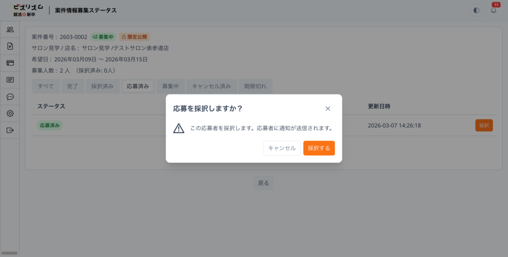 サロン側の都合でのキャンセルの場合は採択後、キャンセルボタンからキャンセルも可能です。