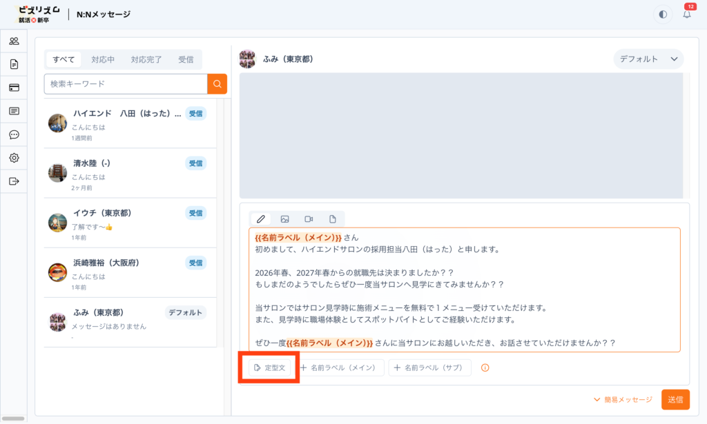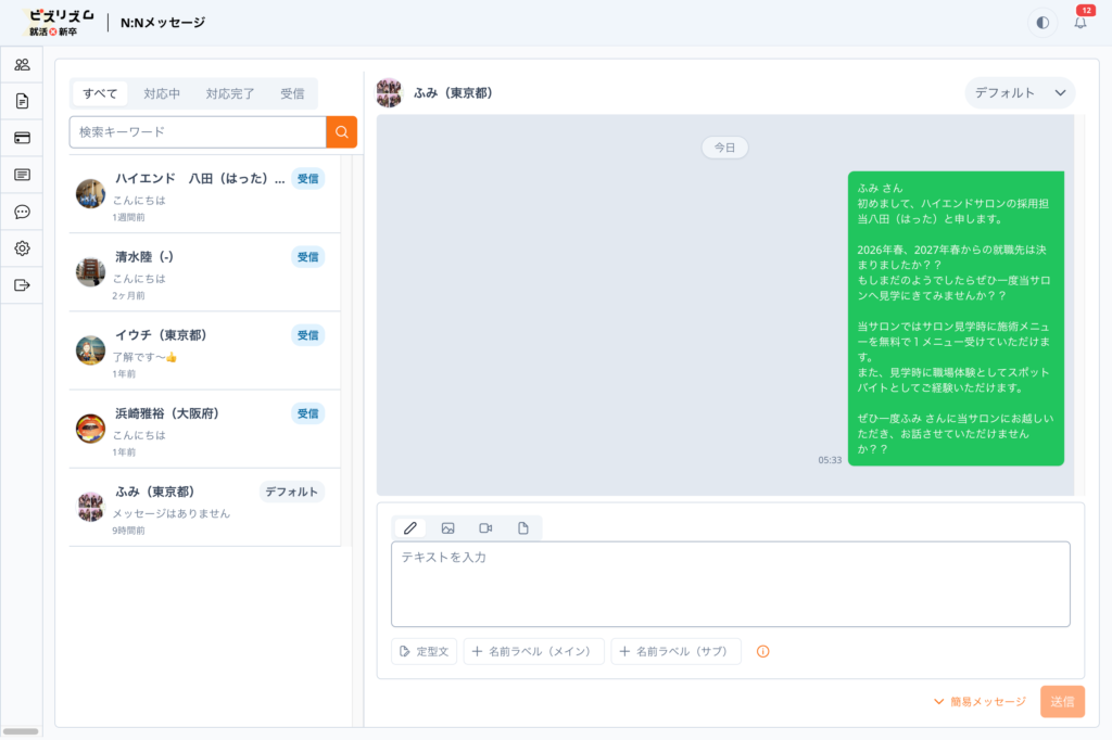 N:Nメッセージより、体験予定の学生との連絡が可能です。